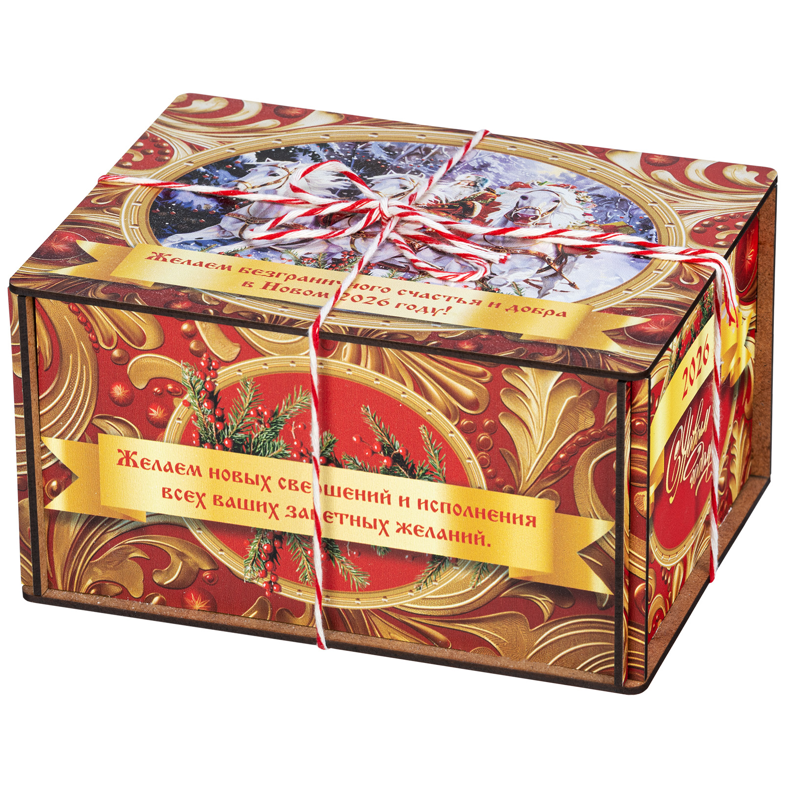 Ищете новогодний сладкий подарок подростку или взрослому? Присмотритесь к набору “Золотые узоры” - это оригинальный конфетный набор в яркой упаковке. В подарок входит килограмм вкусных и разнообразных кондитерских изделий от ведущих фабрик, а также небольшой памятный сувенир в виде символа наступающего 2026 года.  Сладости бережно упакованы в небольшой деревянный ящик, выполненный в сочетании золотого и красного цветов. На крышке есть небольшая иллюстрация с изображение Дедушки Мороза в упряжке белых грациозных лошадей. Упаковка аккуратно перетянута цветной ручкой шнурком, что еще больше добавляет ей привлекательности.